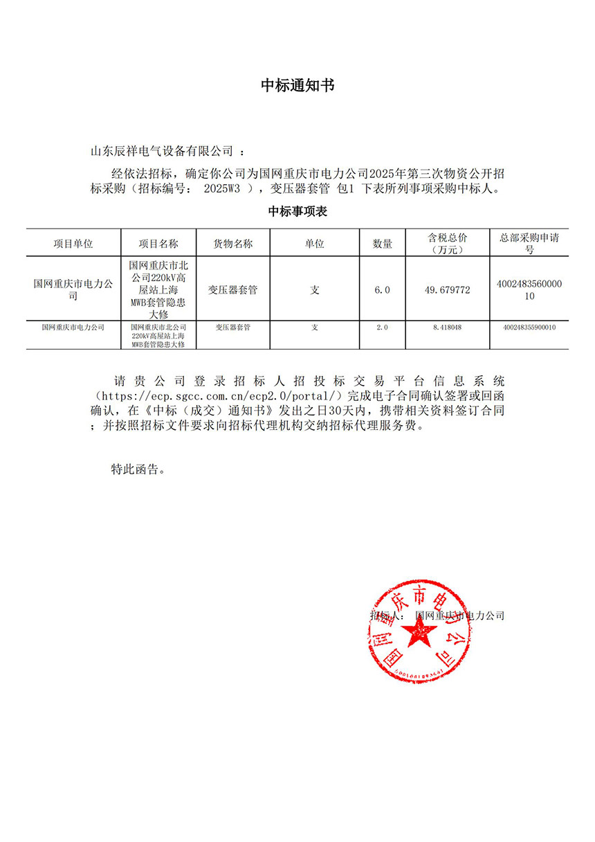 • 2025.02.14 110kV瓷絕緣穿墻套管中標(biāo)通知書